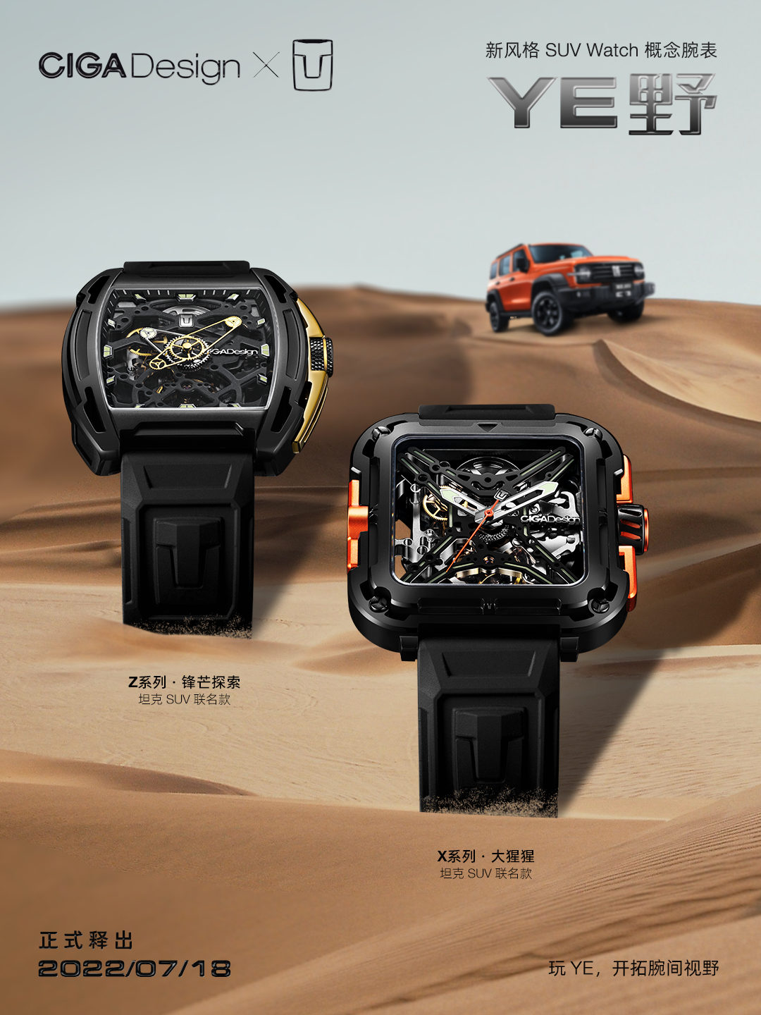 2022年7月18日,中国新锐原创设计师腕表品牌CIGA design玺佳与长城汽车旗下高端越野品牌-坦克共同发布了两款全新联名系列全镂空机械腕表,分别是X系列·大猩猩坦克联名款与Z系列·锋芒探索版坦克联名款;目前两款腕表已在天猫、京东、得物APP、小米有品平台公开发售。作为极具颠覆性设计的原创腕饰与高端越野品牌的跨界联动,两款全新联名腕表在还未发布之前便受到社会各界腕表爱好者以及户外爱好者的广泛关注。